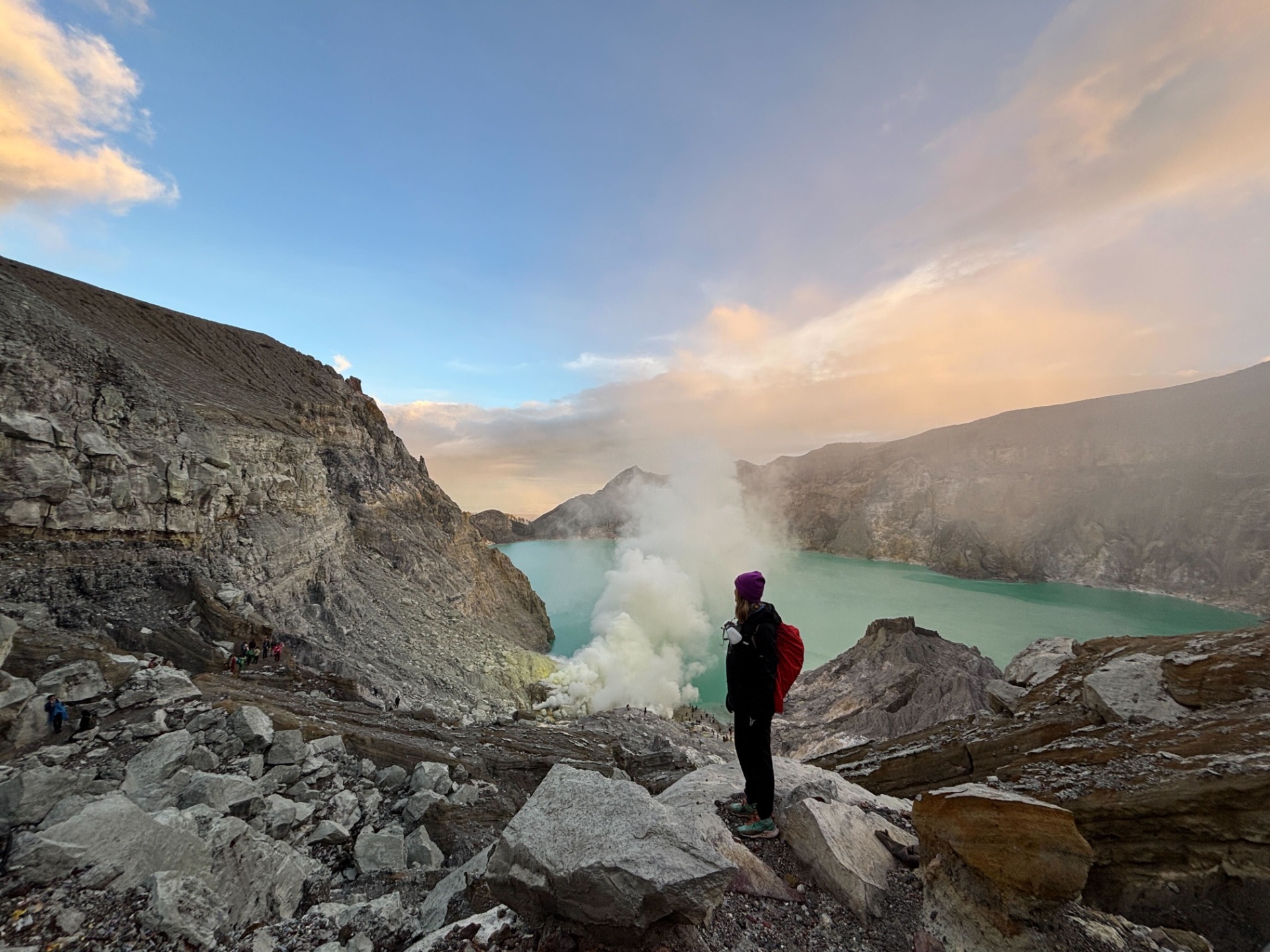 Taky to celý trvá mnohem dýl, než vám tvrdí. A nakonec jsme v kráteru neviděli rozhodně žádnou modrou lávu, jen pár plamínků obsypané lidmi s gopro a já se celou dobu modlila, aby někdo v té tlačenici za mnou nezakopl a neshodil nás všechny před sebou jako domino do kráteru sopky. Jediný, co bylo opravdu krásný, býl výhled z prostředku kráteru dolů do kráteru za východu slunce.